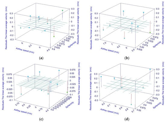 The residual graphs corresponding to the average instantaneous velocity [44]: (a) a particle measuring 27 mm in diameter; (b) a particle measuring 35 mm in diameter; (c) a particle measuring 47 mm in diameter; (d) a particle measuring 56 mm in diameter.
