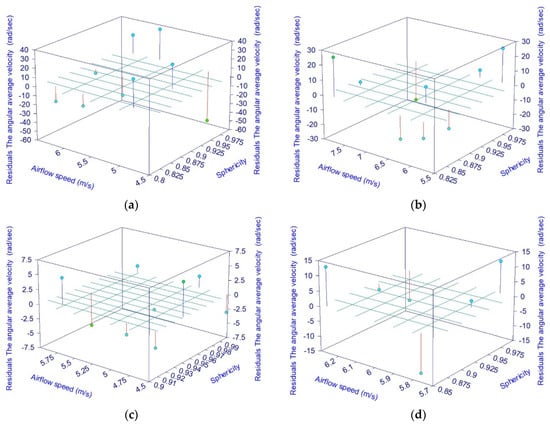 The residual graphs corresponding to the variation in the average angular velocity [44]: (a) a particle measuring 27 mm in diameter; (b) a particle measuring 35 mm in diameter; (c) a particle measuring 47 mm in diameter; (d) a particle measuring 56 mm in diameter.