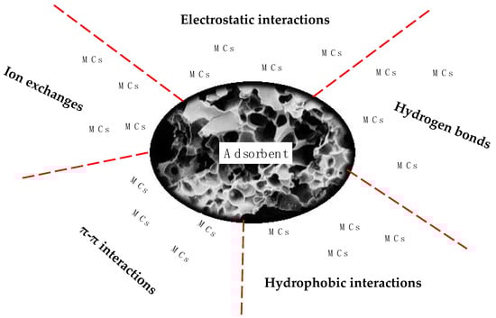 The interaction of MCs with different types of adsorbents is associated with different mechanisms, which are interrelated with the properties of the adsorbent, the characteristics of the MC molecules, and the solution characteristics [60,133].