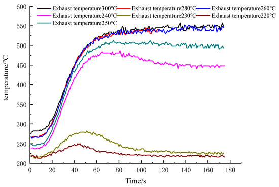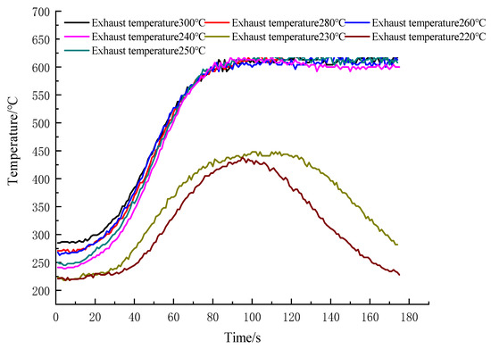 The DOC light-off temperature is the inlet temperature of the DOC when the DOC heats up the diesel fuel to the target temperature of the DPF active regeneration (600 °C), which is an important indicator of the DOC oxidation capacity: the lower the ignition temperature is, the stronger the oxidizing capacity of the DOC. The experimental study investigated the DPF pre- and post-temperature variations at different DOC inlet temperatures. Figure 3 shows the variations in the DPF pre-temperature (T2) when the exhaust flow rate is 650 kg/h, and the DOC inlet temperature (T1) is 220, 230, 240, 250, 260, 280 and 300 °C for active regeneration. The figure shows that a higher T1 temperature and a shorter time for the DOC to increase the DPF to the target temperature set for active regeneration improve the DOC catalyst activity. When T1 is 220 and 230 °C, the T2 temperature increases marginally and then decreases, and the DPF regeneration temperature cannot reach the set temperature. These results indicate that when the DOC inlet temperature is less than 240 °C, the ignition temperature cannot be reached. Figure 4 shows the trend of the temperature change after DPF (T3). When the T1 temperature is 240 °C or higher, the internal temperature of the DPF can rise to the set value of 600 °C, which can meet the requirements of active regeneration of the DPF. Thus, the ignition temperature of the DOC inlet is more than 240 °C.