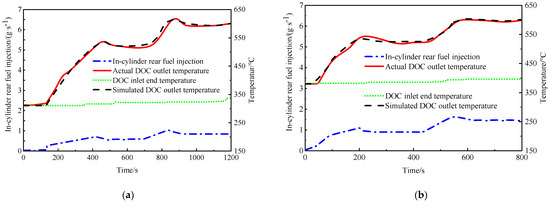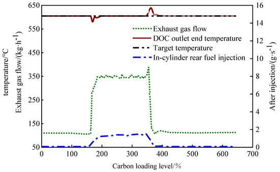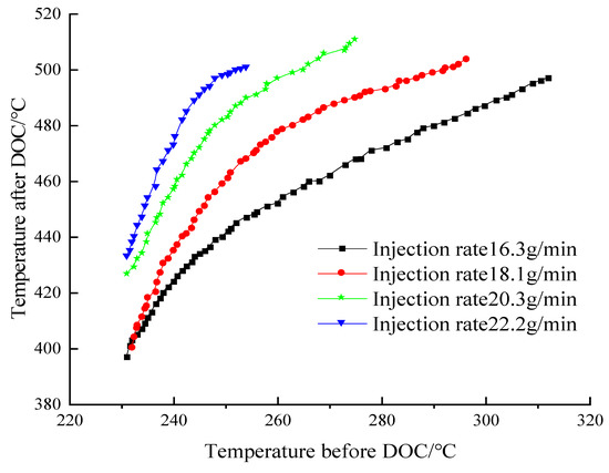 Figure 5 shows the temperature change before and after the DOC corresponding to the change of fuel injection rate: the larger the injection rate, the faster the exhaust temperature rises after DOC, and the shorter the time to reach the target temperature of active regeneration set by the DPF. As shown in Figure 5, the DPF active regeneration requirements can be met when the injection rate is 16.3–22.2 g/min. When the DOC inlet exhaust temperature is more than 300 °C, a low injection rate of 16.3~18.1 g/min can be used to inject the right amount of fuel to achieve the DPF active-regeneration target temperature. When the vehicle DOC inlet exhaust temperature is 240–280 °C, a higher injection rate of 20.3~22.2 g/min is required. When the vehicle DOC inlet temperature is 240–280 °C, a higher injection rate of 20.3–22.2 g/min is required to make the DPF reach the set target temperature quickly to reduce the secondary pollution caused by hydrocarbon leakage. When the DOC inlet temperature is less than 240 °C, the DPF active regeneration cannot be performed.