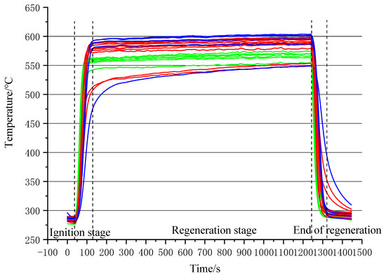 The active regeneration process of DPF can be divided into three phases: ignition, regeneration, and the end of regeneration. Ignition occurs from 30 to 120 s in Figure 6, during which the DPF temperature rises from 280 to 580 °C within 90 s with a temperature rise gradient of 3.3 °C/s. Regeneration occurs from 120 to 1250 s in Figure 6, and the temperature change is small at this stage. The end of regeneration occurs from 1250 to 1350 s in Figure 6, when the diesel injection is stopped, the temperature in the DPF rapidly drops to the current exhaust temperature, and the active regeneration of the DPF ends.