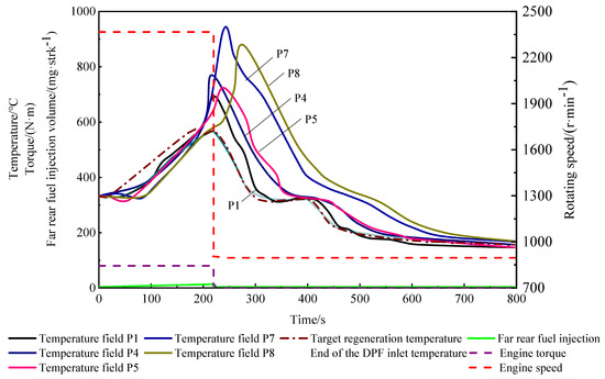 Figure 10 shows the variations in the engine speed, torque and temperature field in the DPF with the time during DTI regeneration at test measurement point E (Table 4), where the initial carbon load was approximately 150% of the SML limit, and the regeneration target temperature was 575 °C. The active regeneration of the DPF was started at 30 s into the test. With the rise of the regeneration target temperature, the far-back injection volume gradually increased. When the DPF inlet temperature reached the target temperature (575 °C), the far-back injection volume reached the maximum value of approximately 10.5 mg/strk (the test far-back injection timing was set to 120 °C after the upper stop), at which time the throttle position was quickly reset, and the far-back injection volume was closed, thus triggering the DTI regeneration. The test results show that the maximum peak temperature near P7 at the back end of the DPF axis after the DTI regeneration is triggered at approximately 950 °C, which indicates that a large number of the soot particles accumulated in the central area of the back-end of the DPF during the loading process, while the exhaust flow decreased after the idling speed was lowered and the convection heat dissipation became weaker. These phenomena resulted in a rapid increase in the temperature of the rear-end of the carrier, due to heat accumulation, which in turn promoted the oxidation reaction of soot particles and caused the high temperature in the center of the rear end of the DPF. The results of other test measurement points are similar.