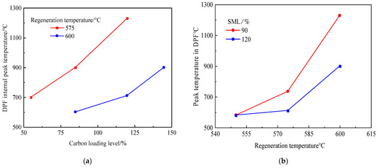 DPF peak temperature vs. soot load level and regeneration temperature. (a) Carbon loads; (b) Regeneration temperature.