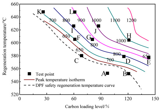 The maximum peak temperature at each test point is statistically analyzed, as shown in Figure 11. The variation graphs of the peak temperature, carbon load, regeneration temperature and the peak temperature isotherm distribution are shown in Figure 12. According to the test results shown in Figure 11, the peak temperature in the DPF increases with the increasing carbon loading at the same regeneration temperature; under the same carbon loading, the peak temperature in the DPF increases gradually with the increasing regeneration temperature. When the regeneration temperature is above 575 °C, the peak temperature in the DPF increases rapidly. This result likely occurs because of the following reasoning. According to formula (2), the active regeneration rate of the DPF is an exponential function of the regeneration temperature; thus, the higher the regeneration temperature is, the more intense the regeneration reaction, and the exothermic rate of the regeneration reaction increases significantly. When the DPF works at a temperature above 800 °C for a long time, it is likely to cause condensation of the active point of the catalyst on the surface coating of the carrier, leading to degradation of the catalyst and further affecting the performance and service life of the DPF [38]. Therefore, the 800 °C isotherm in Figure 12 is considered to be the reference. In addition, considering the combined error of approximately ±14 °C in the exhaust temperature sensor and the A/D sampling channel of the ECU control unit, as well as the error of approximately 10% between the carbon load calculated based on the DPF differential pressure sensor and the real DPF carbon load [29], the DPF safe regeneration temperature curve can be obtained after eliminating the cumulative error. To create the DPF safe regeneration temperature profile, a polynomial equation is fitted to obtain the DPF safe regeneration temperature, as shown by the dashed line in Figure 12: