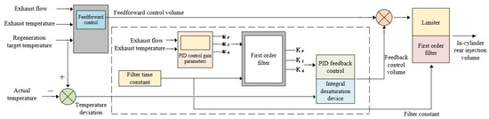 Due to the complexity and variability of the load and environment in the process of vehicle operation, the DPF thermal-regeneration control process is a time-varying process of nonlinear distribution parameters with strong inertia and a large lag, which is disturbed by highly random factors. In addition, the control of the target regeneration temperature from the perspective of the physical boundary of the system is primarily affected by the current exhaust temperature and exhaust flow. Therefore, the control-gain compensation method based on the engine exhaust temperature and exhaust flow is studied to solve the uncertainty problems caused by the difference in the boundary conditions, such as cooling water temperature, inlet temperature and pressure, and the large hysteresis characteristics of the system under the same engine working conditions. Figure 13 shows the top-level schematic of the designed control algorithm structure, which consists of two parts: feed-forward control path and feedback control path. The feed-forward control quantity signal and the feedback control quantity signal are superimposed and processed by limiting the first-order filters to generate the final control quantity output.