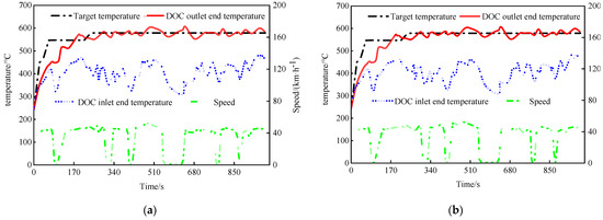 Most of the vehicles in actual road conditions undergo transient operating conditions, such as rapid acceleration or deceleration, and there are drastic changes in the vehicles’ driving speed, road load conditions, engine exhaust flow, exhaust temperature and other disturbing factors in the transient conditions. Therefore, to analyze the performance of the proposed control algorithm strategy in practical applications, real road testing was performed on a light pickup truck with a diesel engine and a DPF aftertreatment system that met the national VI Emission Regulations. Figure 17 shows the road test results under two typical driving conditions, which are divided into urban and suburban driving conditions with average speeds of approximately 40 and 70 km/h, respectively. Analyzing the experimental results shown in Figure 10, the designed algorithm strategy shows the same dynamic response quality and anti-disturbance performance as the aforementioned simulation results, when the disturbances such as vehicle speed, exhaust temperature and exhaust flow rate at the inlet end of the DOC change rapidly during real road driving. The overshoot caused by the change in the target regeneration temperature at the beginning of the regeneration phase is less than 3%, and the system quickly stabilizes without static errors. The target regeneration temperature is set to 580 °C after 300 s of the test. The temperature control algorithm has strong anti-interference power for the changes in vehicle speed and engine exhaust temperature. The tracking error of the real DOC outlet temperature to the target temperature remains within ±20 °C, which ensures the safe, reliable and efficient regeneration of the DPF.