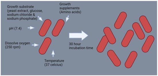 The growth substrate, growth supplements, pH, dissolved oxygen (DO), temperature, and incubation time all have an impact on the development of Pasteurella spp. by fermentation, which can promote high viability and biomass cells when optimized. Figure 2 depicts the variables that influence the fermentation process of Pasteurella spp. after 30 h of incubation time. According to Oslan et al. [9], using growth substrate (yeast extract, glucose, sodium chloride, and sodium phosphate), growth supplements (glutamic acid, cysteine, glycine, methionine, lysine, tyrosine, and histidine), pH (7.4), dissolving oxygen (250 rpm), and temperature (37 °C) can increase by up to 16 times the growth of the gdhA derivative P. multocida B:2 mutant.