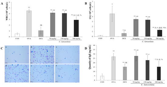 C. laceolata suppressed the population increments of white blood cells (WBC) and lymphocytes (LY) in the bronchioalveolar fluid (BALF) and the quantity of IgE in serum, which were increased by ovalbumin treatment. (A) C. laceolata dose-dependently decreased the number of WBC, which was upregulated by ovalbumin. (B) The population of lymphocytes was especially decreased by C. laceolata treatment. (C) The dose-dependent decrement of inflammatory cells by C. laceolata was observed from the Diff-Quick stain. Scale bar, 50 μm; magnification, ×400. a, CON; b, OVA; c, DEX, d, 50 mg/kg/day C. laceolata, e, 150 mg/kg/day C. laceolata. f. 300 mg/kg/day C. laceolata. (D) C. laceolata dose-dependently decreased the level of serum IgE, which was up-regulated by ovalbumin treatment, and specifically, in the 300 mg/kg/day C. laceolata treatment group, the level of serum IgE was similar to that in the dexamethasone treatment group. CON, vehicle group; OVA, ovalbumin-induced asthma group; DEX, positive control group (1 mg/kg/day dexamethasone with OVA); 50 mg/kg/day C. laceolata, 50 mg/kg/day C. laceolata treated group with OVA; 150 mg/kg/day C. laceolata, 150 mg/kg/day C. laceolata treated group with OVA; 300 mg/kg/day C. laceolata, 300 mg/kg/day C. laceolata treated group with OVA. * p < 0.05 vs. CON; ** p < 0.001 vs. CON; $ p < 0.05 vs. OVA; $$ p < 0.001 vs. OVA; # p < 0.05 vs. DEX; ## p < 0.001 vs. DEX; @ p < 0.05 vs. 50 mg/kg/day C. laceolata; @@ p < 0.001 vs. 50 mg/kg/day C. laceolata; % p < 0.05 vs. 150 mg/kg/day C. laceolata; %% p < 0.001 vs. 150 mg/kg/day C. laceolata.