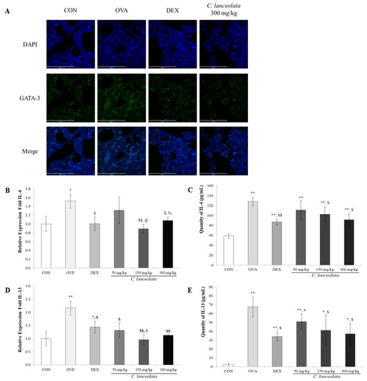 C. laceolata controlled the level of ovalbumin-induced Th2-related cytokines such as IL-4 and IL-13 by inactivating the Th2 cell transcription factor, GATA-3. (A) The expression result of the Th2 cell transcription factor, GATA-3, according to the C. laceolata treatment. In order to release the Th2-related cytokines, GATA-3 should translocate from the cytoplasm to the nucleus to conduct the Th2 cell transcription factor. The released levels of GATA-3 both in the dexamethasone treatment group (DEX) and the 300 mg/kg/day C. laceolata treatment group were higher than that in the ovalbumin treatment group, and that meant that the dexamethasone treatment and C. laceolata treatment prevented ovalbumin-induced GATA-3 activation. Scale bar, 50 μm; magnification, ×400. CON, vehicle group; OVA, ovalbumin-induced asthma group; DEX, positive control group (1 mg/kg/day dexamethasone with OVA); C. laceolata 300 mg/kg, 300 mg/kg/day C. laceolata treated group with OVA. (B) C. laceolata treatment suppressed the ovalbumin-induced increase in IL-4 cDNA levels and (C) IL-4 protein levels to levels similar to the dexamethasone treatment. (D) C. laceolata treatment down-regulated the IL-13 cDNA level and (E) the IL-13 protein level, and specifically, the decreased levels were similar to that of the dexamethasone treatment group. CON, vehicle group; OVA, ovalbumin-induced asthma group; DEX, positive control group (1 mg/kg/day dexamethasone with OVA); C. laceolata 300 mg/kg, 300 mg/kg/day C. laceolata treated group with OVA. * p < 0.05 vs. CON; ** p < 0.001 vs. CON; $ p < 0.05 vs. OVA; $$ p < 0.001 vs. OVA; # p < 0.05 vs. DEX; @ p < 0.05 vs. 50 mg/kg/day C. laceolata; % p < 0.05 vs. 150 mg/kg/day C. laceolata.