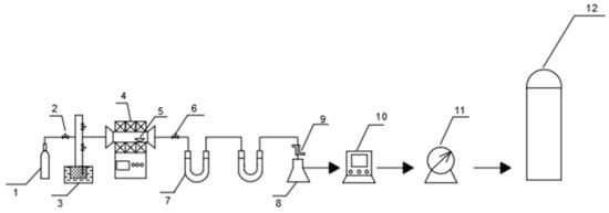 Cow dung semi-coke gasification apparatus. 1, nitrogen bottle; 2, inlet valve; 3, steam generator; 4, three-stage tubular furnace; 5, porcelain cup; 6, outlet valve; 7, desiccant; 8, condensate pipe; 9, conical bottle; 10, flue gas analyzer; 11, pressure pump; 12, gas storage tank.