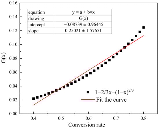 The experiment shows that the conversion rate of cow dung x is greater than 0.4. In Equation (10), when the conversion rate x is between 0 and 0.4, the value of the integral equation of the reaction function G(x) is small and does not meet the actual value of the study. When the conversion rate x is between 0.4 and 0.8, the integral equation of the reaction function G(x) is fitted and approximated as G(x) = 0.25x, as shown in Figure 2.