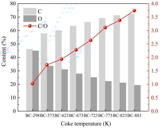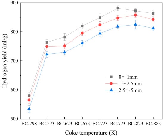 As shown in Table 5 and Figure 3, the effect of the semi-coke treatment on the gasification process was significantly enhanced by the cow manure, and different preparation temperatures and particle diameters had an effect on the experimental results. As the preparation temperature increased, the hydrogen yield gradually increased. At preparation temperatures above 773 K, a small decrease in hydrogen yield occurred. The difference between the results of BC-773 and BC-873 was not significant, so the preparation temperature of 773 K was chosen as the preferred temperature in consideration of the cost and energy consumption of the experiments. This is because the semi-coke process improves the reaction conditions of the secondary cracking and reforming reactions, reduces the volatile content and carbon content of cow dung, and because the semi-coke treatment facilitates the rapid reforming reaction of water vapor. The small size of the semi-coke particles, the large specific surface area and the high reaction efficiency of the contact with the water vapor stream facilitate the semi-coke gasification reaction and increase the hydrogen yield [22].