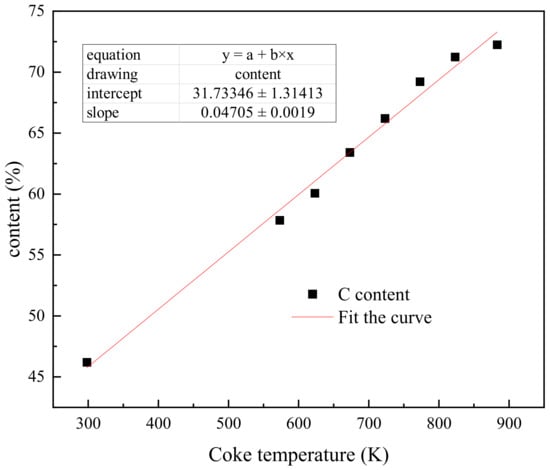 Compared with the in situ gasification process, the experimental unit for the semi-coke gasification process does not have to be as gas-tight, which helps to improve the safety of the entire experimental process. In the semi-coke process, cow dung is pre-treated and gasified at high temperatures in a tube furnace, separating the charring and gasification products of the dung to facilitate the reforming reaction without affecting the secondary cracking of the volatile fraction. The C content increases and the O content decreases after the semi-coke treatment, resulting in a rapid increase in the C/O ratio, as shown in Figure 4. The fitted curve for the semi-focused elemental C content γC versus the preparation temperature T1 is: γC = 4.7 × 10−4T1 + 0.32, as shown in Figure 5. The process of preparing hydrogen-containing gas from semi-coke effectively reduces the volatile content of cow dung and increases the solid carbon content, facilitating the water vapor reforming reaction, while the pyrolysis process allows for sufficient secondary cracking of the tar to facilitate hydrogen production.