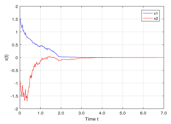 According to the above analysis, (28) satisfies the conditions of Theorem 1. Then, based on Euler-Maruyama method, Figure 1 and Figure 2 are plotted by MATLAB. Specifically, Figure 1 simulates the states trajectories of (28) with the initial function , . And Figure 2 pictures the response of the mean square value of the system states (for the requirement of simulation, we let , in which is the sth sample path of , that is, the mean square value of the system states at each moment is obtained by taking the average of the values of 1000 sample paths). Obviously, in this numerical example, the simulation results show that the system is exponentially stable in the mean square sense, which verifies the validity of Theorem 1.