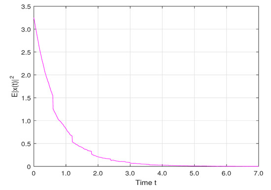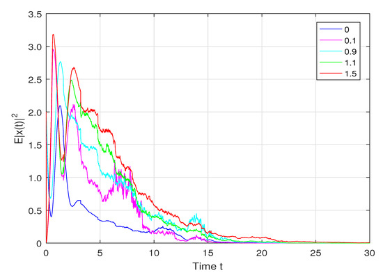 Letting the curves of with the corresponding are drew in Figure 3 under the same initial condition , . That is, the trajectories of the mean square value of the system states with the same drift term delay but different diffusion term delay are plotted in Figure 3. By comparing the trajectories, one obtains that although the systems with different diffusion term delays converge to 0 at different rates, it is seen that the systems are all mean-square stable, which verifies the feasibility of Theorem 2.