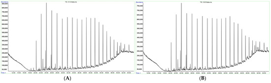 The results of chromatographic analysis of ARPD samples with a solvent and with the addition of EVA showed that the component composition of ARPD is represented by high saturated hydrocarbons C15–C44 and their isomers. Their chromatograms are shown in Figure 1 and tabulated data are presented in Table 3. Naphthenes and polycyclic aromatic hydrocarbons, derivatives of cyclohexane and phenanthrene were found in small amounts. Comparison of the percentage of alkanes and their isomers shows a decrease in the amount of all detected alkanes and their isomers in ARPD samples with a solvent upon addition of EVA, which confirms the effectiveness of the inhibitor. The addition of EVA leads to the dissolution of solid paraffins and their isomers. At the same time, when EVA was added to the ARPD composition, new hydrocarbons were identified, such as octadecane, pentacosane, heptacosane, nonacosan, hexatriacontane, the presence of which in the ARPD composition with the solvent was not confirmed by the chromatogram.