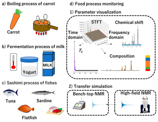 In our previous study, food processes, such as boiling carrots and fermentation of yogurt and sashimi raw fish, contain both small and large molecules, which produce broad NMR spectrum peaks [13,14,52]. Their components and physical properties change during food processes. In this study, we investigated methods and tools for parameter visualization and characterization of the components and the physical properties of mixtures in the food process (Figure 1a–c). The parameter visualization and transfer of NMR spectra from high-field to low-field NMR for NMR spectral characterization of compounds in food process samples in agriculture (a; boiling process of carrots), livestock (b; fermentation process of milk), and fishery (c; sashimi process of fishes) is summarized in Figure 1. The output of the parameter visualization process in tuna’s 1H NMR data are shown in Figure S1. NMR data are processed as follows. (1) original FID, (2) zero-filling, (3) Fourier transform, (4) autophase correction, (5) manual phase correction, (6) autophase correction after manual phase correction, (7) baseline correction, (8) inverse Fourier transform, (9) water signal deletion and z-score calculation, (10) inverse Fourier transform after water signal deletion, (11) window function processing, (12) STFT, (13) visualization of the frequency domain of STFT-processed data, (14) z-score calculation and peak detection, (15) fitting of the frequency domain, and (16) visualization of peaks in the time domain.