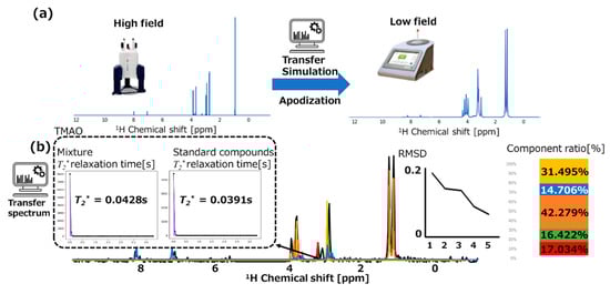 (a) High-field 1H-NMR spectra before and after the data transfer simulation. (b) Assignment results and root-mean-square deviation values of spectra for standard compounds, which were transferred to the corresponding compounds in the food mixtures (tuna) analyzed by benchtop low-field NMR. Red, green, orange, blue, and yellow represent the spectrum and component ratio of choline, TMAO, lactate, histidine, and creatine, respectively. Calculated representative T2* relaxation times are displayed for TMAO in the food mixture and its standard compound.