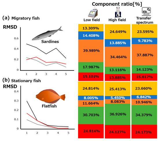 The RMSD values for the tested sardine sample for the low-field (Figure 5a, left, black line), high-field (Figure 5a, left, red line), and transfer spectra (Figure 5a, left, gray line) were 0.208, 0.156, and 0.0810, respectively. For the flatfish sample, the values were 0.00301, 0.00132, and 0.00101, respectively (Figure 5b, left). These results implied improvements in the low-field NMR analyses applying the proposed transfer simulation method to high-field NMR. A possible reason for the larger RMSD value in (a) was the effect of pH in vivo. We have previously observed chemical shifts caused by the pH differences in the high-field NMR data of standard compounds [46]. In this study, we focused on histidine, which showed large differences in chemical shift between the spectra of food mixtures and sample compounds. We found significant chemical shifts in the data obtained from different pH values (e.g., Figure S5) against each standard compound. The use of experimental optimization will probably increase the RMSD values, therefore improving the proposed transfer simulation method.