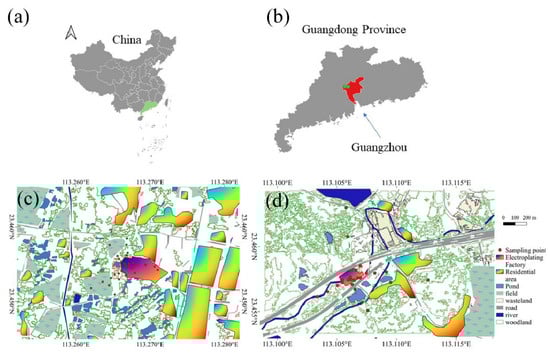 The study areas, which are located northwest of Guangzhou and have been polluted by human activities, particularly heavy metals, have produced major environmental issues. The research locations are two particular areas surrounding two electroplating plants (Factory A and Factory B, which are 16 km apart) in Guangzhou, as illustrated in Figure 1. A subtropical monsoon climate dominates these two places, with an average annual precipitation of 1694 mm and a mean annual temperature of roughly 21.8 °C []. Its climate is distinguished by hot summers and mild winters. Precipitation occurs frequently and quickly recharges the groundwater and subsurface water systems. The groundwater has a shallow water table that is only 0.8 m below the surface.