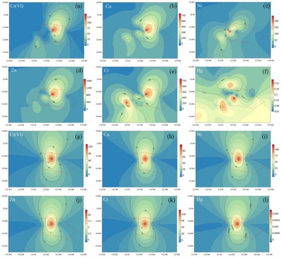 Distribution of heavy metals in surface soil (0–20 cm) of Factory A and its surrounding area. (a–f) are the contour plots of the heavy metal concentration (mg/kg) in soil. (g–l) are the contour plots of the heavy metal concentration (mg/L) in groundwater.