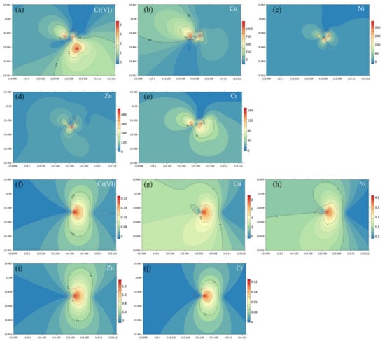 Figure 3a–e depict the concentration distribution patterns of Cr (VI), Cu, Ni, Zn, and Cr, with larger concentrations at the industrial site. The same distribution indicates that these five heavy metals originated from the same sources. The concentration gradient of these five heavy metals extends mostly northwest–southeast. Despite the fact that the factory was closed three years ago, the high concentration remains, indicating long-term pollution in the soil. Figure 3f–j depict a similar pattern of the five heavy metal pollutions of groundwater at concentrations far beyond natural environmental value.