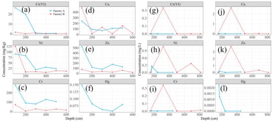As shown in Figure 4a–f, similar heavy metal concentration patterns occur for both industries, with heavy metal concentrations being greatest in the surface soil, within the range of 0 to 20 cm. Cu, Ni, Zn, and Cr in soil exhibit a similar trend in both factories, rapidly reducing with depth, especially around 30 cm, and gradually decreasing at a higher depth, suggesting that the diffusing velocity is fast in the topsoil but dramatically lowers in deeper soil. The greatest concentrations of Zn and Cu in surface soil are found in Factory A and Factory B, respectively (Figure 4d,e). It follows that the Zn and Cu concentrations in groundwater are likewise the greatest (Figure 4j,k). In contrast, both Cr (VI) concentrations are lowest in groundwater because Cr (VI) concentrations are lowest in soil. The concentration of Hg in soil and groundwater follows a similar pattern, with the maximum concentration in the surface soil. The link between heavy metal concentrations in soil and groundwater shows that soil transfers heavy metals into groundwater. In comparison to Factory B, the greatest heavy metal concentrations in Factory A are found mostly in shallower groundwater. The largest concentrations of Cr (VI), Zn, and Cr are found at roughly 300 cm, showing that the heavy metal enters by gravity and leaching.