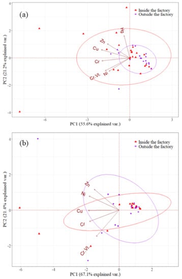 Contribution of each heavy metal to the primary component loading obtained by the principal component analysis from factories. The triangle points denote the samples collected in the factory site. The circle points denote the samples collected surrounding the factory site. The ellipses individually represent the regions in the factory site and surrounding area grouped by a default 68% confidence interval. Principal component score plot of sampling sites from (a) Factory A, (b) Factory B.