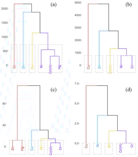 Cluster analysis of the heavy metals in soil for (a) Factory A, (b) Factory B; (c) in ground-water for Factory A; (d) for Factory B.