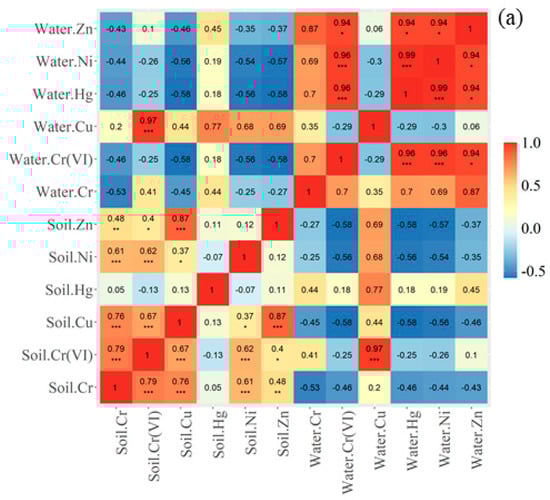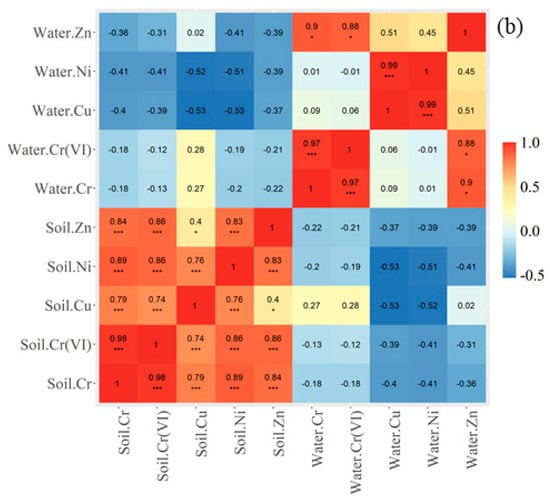 Correlation matrix of surveyed heavy metals in soil and groundwater for (a) Factory A, (b) Factory B. Dotted cell denotes significant correlation (* p ≤ 0.5, ** p ≤ 0.01, *** p ≤ 0.001).