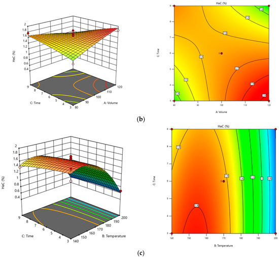 where Y is the predicted response and A, B, and C are the test variables: volume of used solvent (mL), temperature (°C), and time (min), respectively. The F-test was employed to determine the statistical significance of Equation (1), and the analysis of variance (ANOVA) for the response surface quadratic model is presented in Table 3.