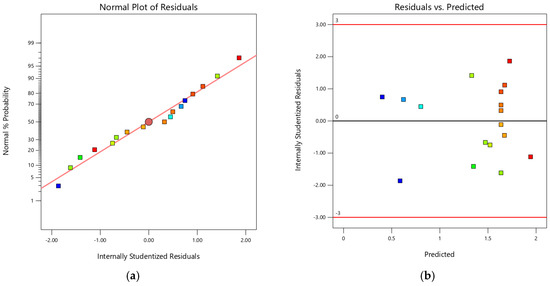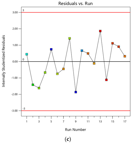 (a) The normal probability plot of residuals, (b) plot of internally studentized residuals versus experimental runs, and (c) plot of predicted and actual values.
