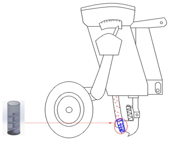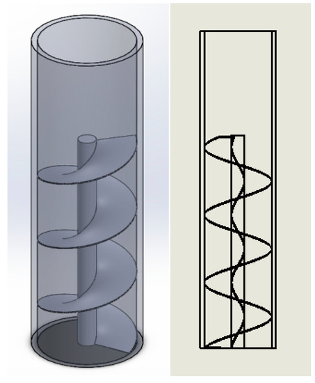 The seed tubes (containing the helix) shown in Figure 1, were made from a PLA+ material with a layer thickness of 0.2 mm using a 3D printer. The dimensions are presented in Table 1. The diameter of the helix in the seed tube was 32 mm. The middle shaft of the helix was 6 mm, and the thickness of the spiral leaf was designed as 0.5 mm.