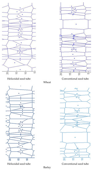 In previous years, extensive efforts have been made by manufacturers to improve volumetric metering devices. However, the problem is that a high uniformity of metering is mixed up in the seed tube, leading again to a random distribution of seed spacing in the field. In order to optimize the performance of a seeder, the structure of the seed-metering device, seed tube, and furrow openers should be optimized in terms of seed movement, trajectory, and deposition [7]. To improve the seed distribution uniformity, Chen and Zhong designed a belt-type seed delivery system for the air-suction metering device. The results of the research showed that the acceptable rate of seed spacing was 98.50% when the height of the outlet (dropping) point of seeds was 100 mm. Through the optimal design of the seed tube, the seeding quality (seed distribution uniformity) was improved. Therefore, the design of the seed tube and the process of seed dropping was found to be the main factor affecting the seeding quality of seeders [8].
