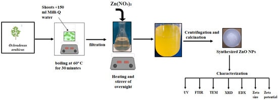 Steps of biogenic synthesis of ZnO NPs from the Ochradenus arabicus extract.