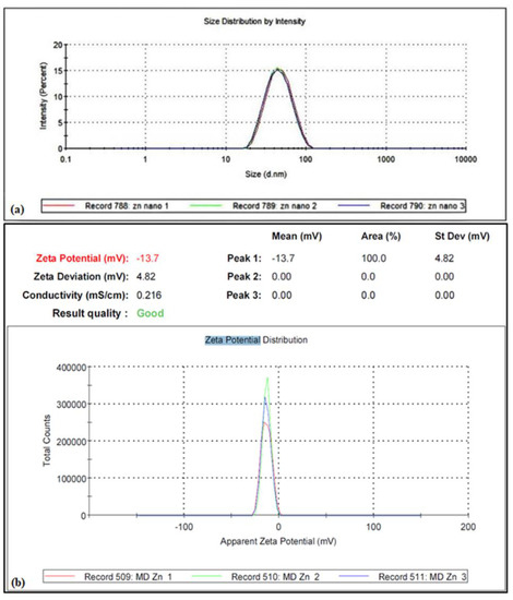 Characterization of zinc oxide nanoparticles by zeta size (a) and zeta potential (b) analysis.