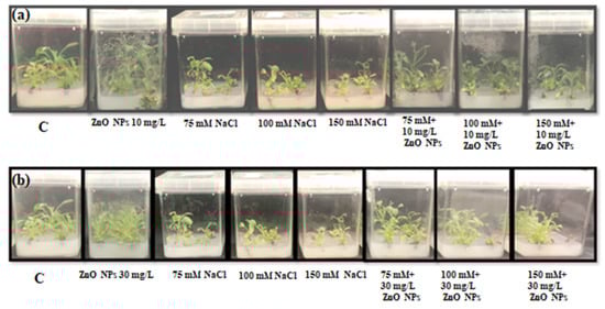 Effect of 10 mg/L (a) and 30 mg/L (b) of zinc oxide nanoparticles on in vitro regeneration of Salvia officinalis subjected to 0, 75, 100, and 150 mM NaCl.