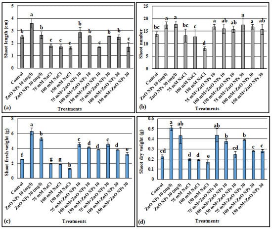 ZnO NPs (10 mg/L and 30 mg/L) effects on shoot length (a), shoot number (b), shoot fresh weight (c), and shoot dry weight (d) of Salvia officinalis subjected to 0, 75, 100, and 150 mM NaCl. Each value is the mean of three replicates ± SD. The significant differences between the treatments are indicated by different letters on bars. The Duncan’s test at p < 0.05 was used for this analysis.