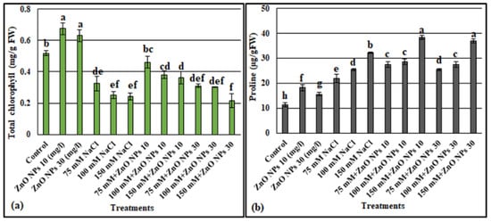 Zinc is a necessary micronutrient playing a vital role in the biomass production via its effects on several physiological and metabolic processes such as chlorophyll biosynthesis []. In our findings, a decrease of total chlorophyll of Salvia officinalis shoot was observed as the concentration of salt increased in MS culture media. However, ZnO NPs treatments, especially at a dose of 10 mg/L, significantly recover this reduction (Figure 6a). Salt stress inhibited the chlorophyll a, b, and carotenoids, which are the main components of the photosynthetic system []. Meanwhile, enhanced levels of photosynthetic pigments were recorded in salt-stressed Lupin ustermis L. and amended with 20, 40, and 60 mg/L of zinc oxide nanoparticles []. Al-Zahrani et al. [] noticed that zinc increased the chlorophyll content via regulating the magnesium transport, which is an important component in the structure of the chlorophyll.