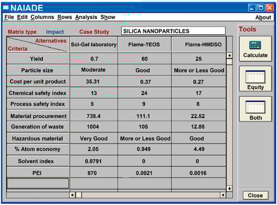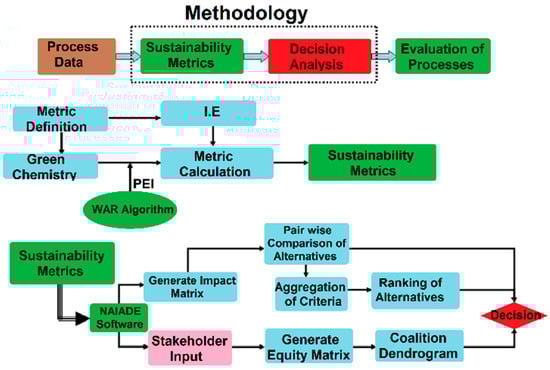 - In 2008 [63], a study to produce nanomaterials was reported; this work coupled both industrial engineering and green chemistry, determining the environmental impact for the synthesis of silica nanoparticles, implicating: a sol-gel process, a simple flame- and an improved HMDSO-flame method. In general, the practice involves two components, shown in Figure 1. The first component involves the development of a set of sustainability metrics and, in a second place, taking up the corresponding decision applying the metrics to evaluate the rate of the process. It is convenient to consider that the sustainability metrics for industrial engineering are process and safety parameters, such as heat of the reaction, chemical interactions, toxicity, pressure, and temperature, among others. For green chemistry, environmental impact metrics include solvent index, generation of waste, and AE, among others.