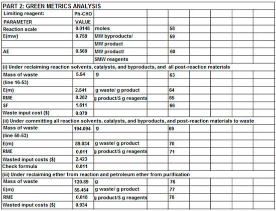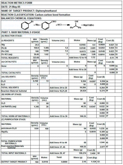 - Andraos, J. Application of green metrics analysis to chemical reactions and synthesis plan. In Green Chemistry Metrics: Measuring and Monitoring Sustainable Processes; Lapkin, A., Constable, D.J.C., Eds.; Wiley: Chichester, UK, 2009; pp. 69–199. [Google Scholar]