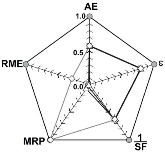- In general, Andraos (2005–2007) combined a set of four metrics [46,47,48], considering both experimental and calculated parameters and displaying the dependence between them: reaction yield, atom economy, stoichiometric factor (SF), and the corresponding value to the aspect that accounts for the solvent during and post-reaction and/or the catalyst recovery, evaluating linear and convergent sequences. This was in addition to the kinetic resolution of chiral substrates.Andraos [47] involved the construction of a synthesis plan tree to know the efficiency of linear and convergent synthesis by the determination of the gRME. In addition, a study involving costs and quantities in the different steps of a reaction depicted by Andraos and Sayed [48] was performed employing a radial pentagon considering the key metrics; this was to guide bachelor students in understanding the green chemistry concept. Complementarily, Andraos [49], using a pentagram, displayed a simplified approach for a linear and convergent synthesis plan by direct application of green chemistry principles.