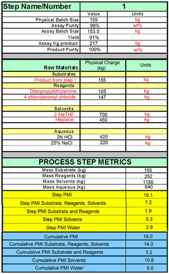 - A novel metric manufacturing mass intensity (MMI) was recently developed [61] to measure the impact of producing API through a synthetic process. The metric is an extension of the PMI metric. It considers the categories excluded in PMI, such as cleaning/preparation, equipment conditioning, effluent management, abatement, overages, circularity, reuse, and recycling. With the MMI metric, it is possible to know the mass requirements to prepare the equipment, verify if some reagent or solvent might be replaced, and know if it is possible to reuse (recycle) any solvent or reagent, and recognize the accurate mass quantification to avoid more optimizations in the process.