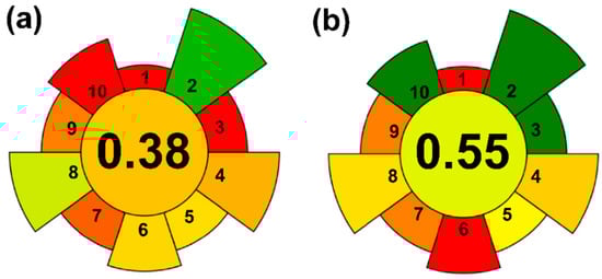 - A new benign index (BI) [67] based on the following environmental hazards—acidification–basification, ozone depletion, global warming, smog formation, inhalation toxicity, ingestion toxicity, inhalation carcinogenicity, ingestion carcinogenicity, bio-concentration, abiotic resource depletion, cancer potency, persistence, and endocrine disruption—was announced by Andraos, vide supra. It is important to mention that this index is defined as a fraction between 0 and 1, and it may be added as another radial axis to previous work [33] to evaluate the green merits of any given chemical reaction. Importantly, this index is applicable to waste, input, and output materials.