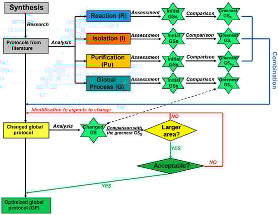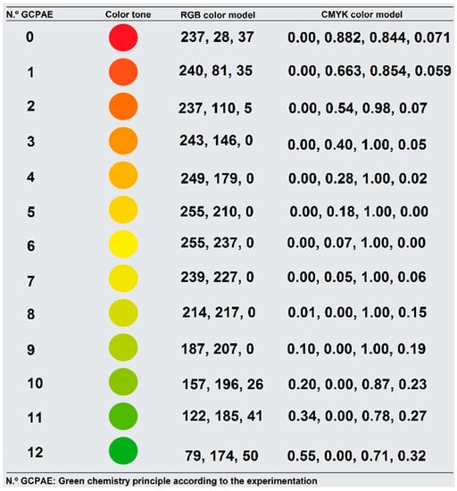 A metric proposal involves a collection of indicators to provide information on different features of a problem [9]. It must be simple, easily measurable, provide clear information, objective rather than subjective, and undoubtedly defined [10,11]; in this sense, to estimate a process (how green is it?) under the GC Protocol, several metrics have been fashioned. Hence, to establish how green a process is, no one could manage what has not been measured [12].