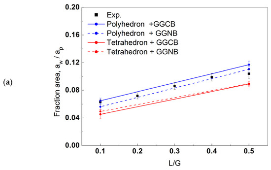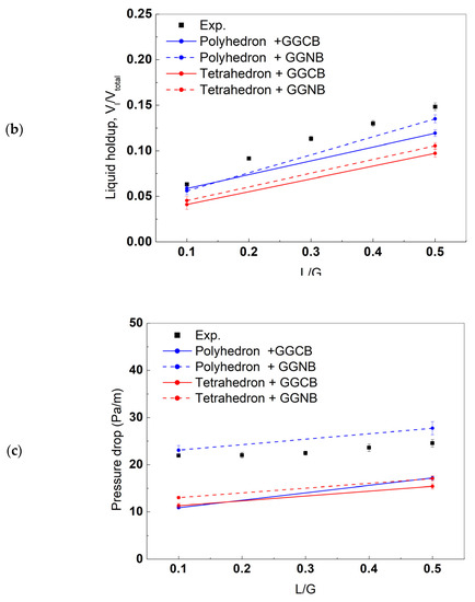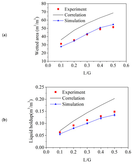 Figure 4 shows a comparison of the hydraulic behaviors among the simulation, experiment, and correlation of the helical ring at L/Gs of 0.1 and 0.5. Figure 4a shows the interfacial area among the experiments, CFD simulations, and correlation. The difference in the interfacial area between the CFD simulation of the helical ring and the experiment was 5.0%, while the difference between the correlation and experiment was 28.6%. The correlation of the helical ring was calculated. As shown in the figure, the correlation from Billet and Schultes [23] overestimated the interfacial area of each L/G. Hence, the interfacial area estimated by the CFD simulation is more accurate than the interfacial area correlation.