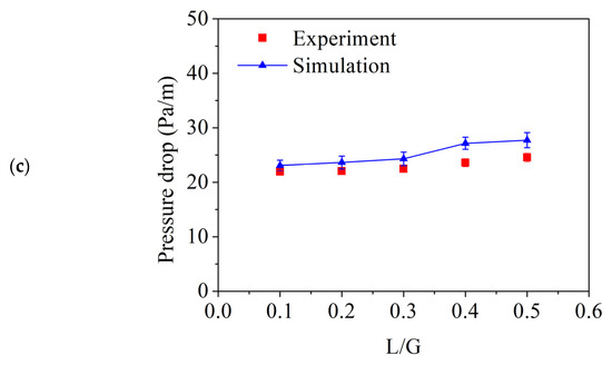 The error in the pressure drop between the CFD simulation and the experiment was 9.7% and is shown in Figure 4c. There is no available correlation to predict the pressure drop of the helical ring; instead, the CFD simulation was implemented to evaluate the pressure drop. The predicted pressure drops of the helical ring matched the experimental data closely, and the simulated results showed a stable curve when L/G changed.
