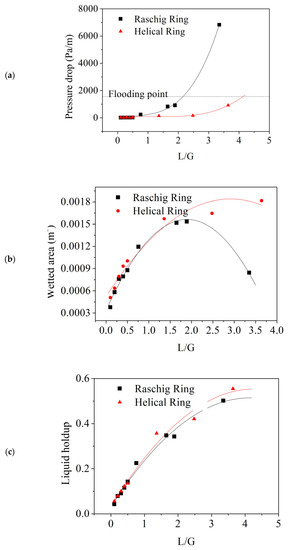 Comparison of (a) interfacial area, (b) liquid holdup, and (c) pressure drop between the Raschig ring and the helical ring.