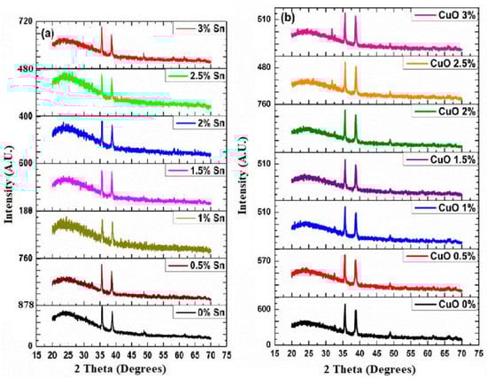 In comparison to other advanced methods, the sol–gel spin coating method is easy, cost effective, friendly to the environment, with low material loss, and it is soundly reproducible. Wu et al. [24] prepared Sn-doped CuO thin films on a glass substrate by the sol–gel method, and studied the effects of Sn doping concentration on the film’s structural, optical, and electrical properties. XRD, SEM, UV-visible spectra, and Hall effect were all studied. The crystallite sizes calculated using Debey Scherrer’s formula were in the range of 84.1–61.8 nm, and the band gap decreased from 2.00 to 1.95 eV with increased Sn doping. Sn-doped CuO films were also prepared by the sol–gel drop cast method, and the doping concentration affected the film’s structural and optical properties, as the band gap value decreased with higher doping in the range 0.0 to 2.0 at% [25].